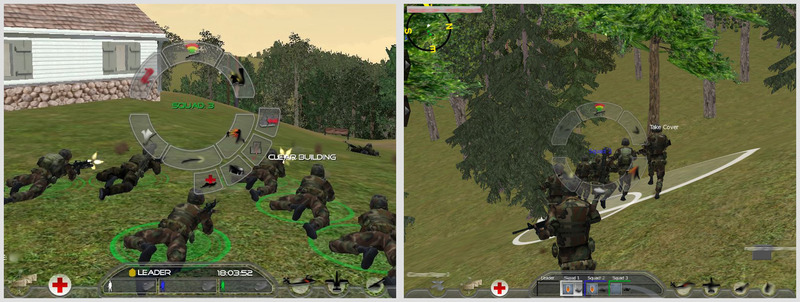 For our new product, which would be known as Full Spectrum Leader, we created a radial menu overlaid on the first-person view, with an inner circle of primary categories and a second set of wedges outside that circle with the specific commands. It was very elegant and easy to use, and well-suited to the fast action of a combat game.